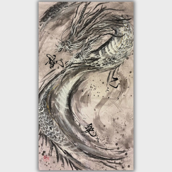 龍のように力強く舞う渦の中には、誠実さを表す「誠」の文字。自分自身を知り、ありのままの自分を愛し、自分に誠実でいたい。真剣な表情の龍を書き上げました。